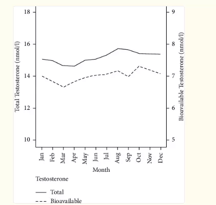 图:男性总睾酮及生物利用度睾酮的季节性波动(月均值):基于以色列27,000人规模研究数据绘制,横轴为月份(1-12月),纵轴为睾酮浓度。实线代表全血总睾酮值,虚线代表游离睾酮值的月均水平。从图表可见,睾酮值在夏季(8-9月左右)上升,冬季末(2-3月左右)下降。