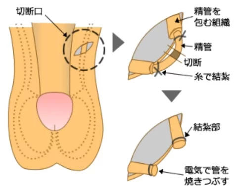 输精管结扎术在日语中亦称为精管切除术或精管结扎术。射精时排出的大部分精液来自前列腺和精囊的分泌物,精子本身仅占极小比例。因此即使切断输精管,射精时的精液量和快感与术前并无差异。